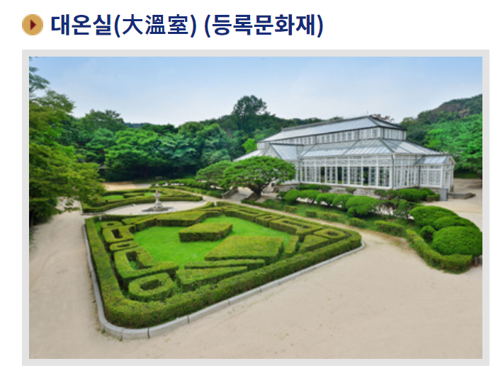 우리에게 잘 알려져 있는 창경궁 대온실의 경우 문화재로 지정이 되어 있습니다. 대온실은 단어 그대로 온실로, 완공은 1909년에 되었습니다. 국내 최초의 서양식 온실로 유명한 대온실입니다. 설계는 일본 사람이 하였고 시공은 프랑스 회사가 진행하였다고 합니다.