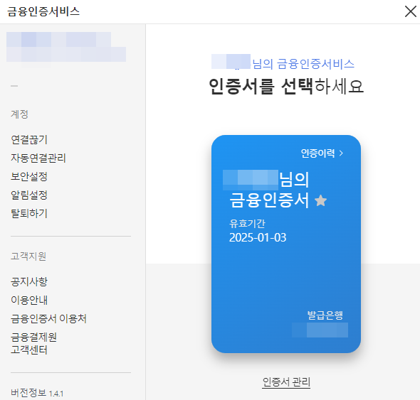 그러면 이렇게 본인의 금융인증서가 자동으로 불러와집니다. 여기서 금융인증서 비밀번호를 입력하면 최종적으로 인증이 완료됩니다.