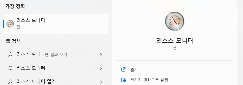 검색창에서 '리소스 모니터'를 입력하고 위와 같이 나오는 리소스 모니터를 실행해 줍니다.