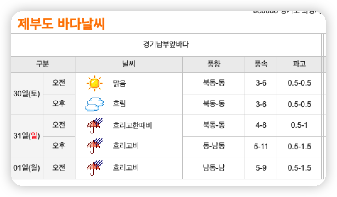 제부도 물때 시간표 사진만 보고 어려우실 수 있어서 최대한 알기 쉽게 설명해 드렸는데, 조금 더 쉽게 물때표를 보고자 하신다면 아래의 내용을 참고해주세요.