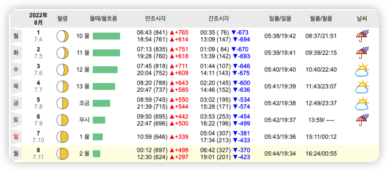 그럼 이제 막바지 휴가기간이라 할 수 있는 8월 둘째 주 제부도 물때시간표를 살펴보겠습니다.
