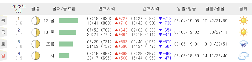 제부도 물때 시간표 9월에는 어떤 시간대에 물이 빠지고 나오는지 일자별로 자세하게 나와 있습니다. 이 뿐만 아니라 해가 뜨고 지는 일출 및 일몰시간, 바다 날씨 등 날씨 앱 등을 통해 확인할 수 있는 기상정보 역시 한 번에 파악할 수 있습니다.