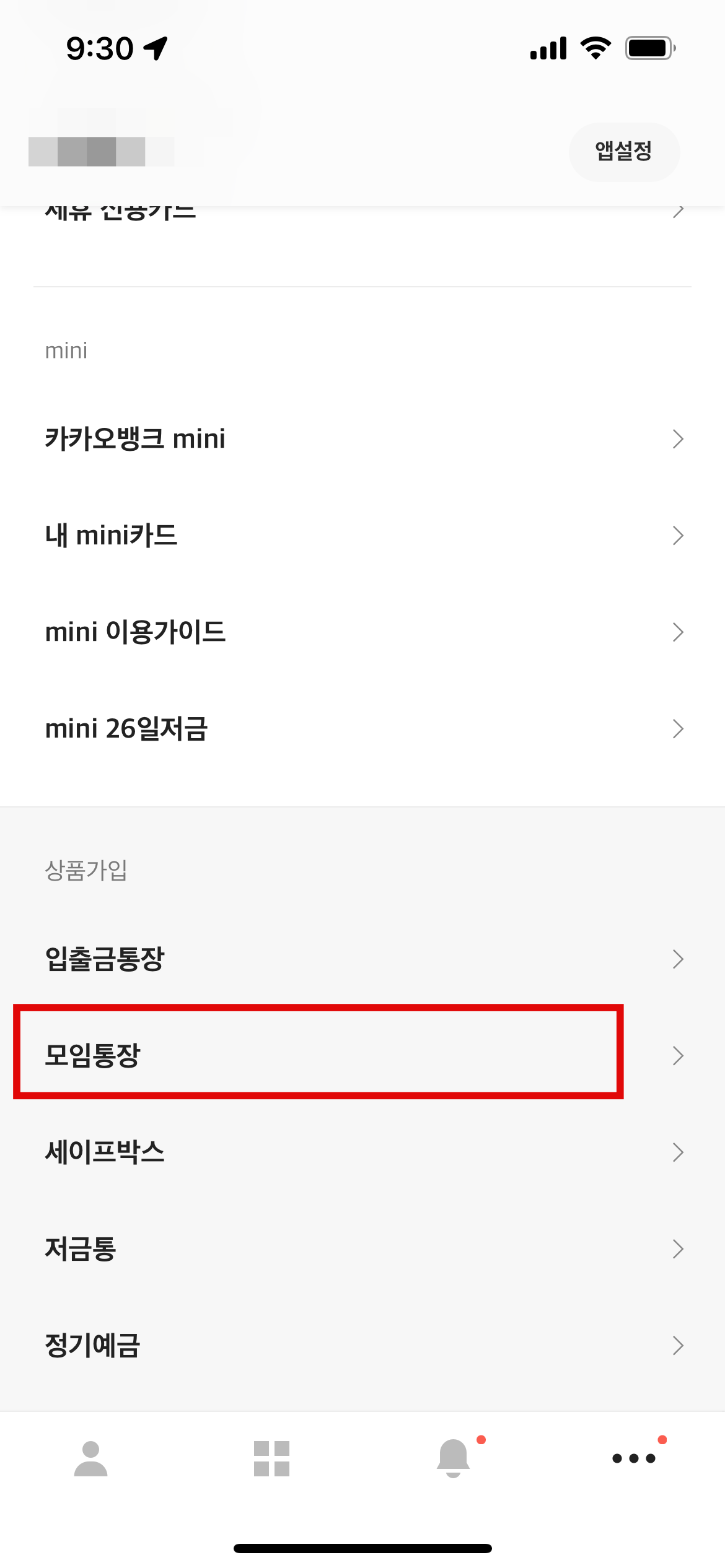 먼저, 카카오뱅크 메뉴(우측 점 3개)에 진입하셔서 "모임통장"을 눌러줍니다.