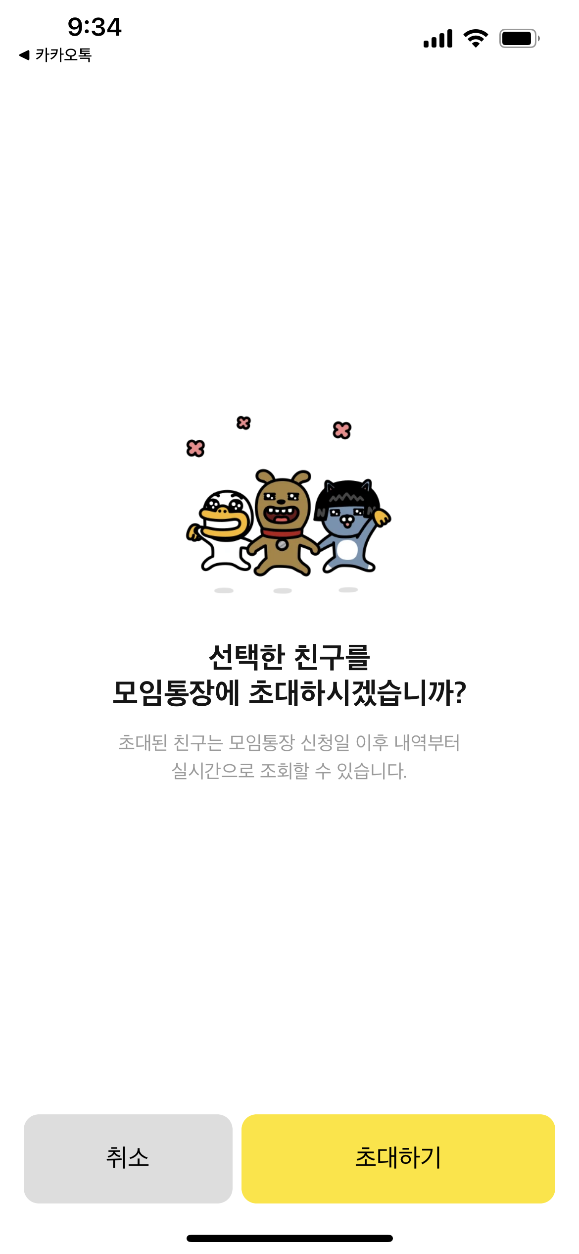 선택한 친구들을 카카오뱅크 모임통장에 초대할 것인지 최종적으로 묻습니다. 초대하기를 눌러주시면, 우측 화면과 같이 친구 초대 완료 메시지가 뜹니다. 초대 직후 해당 멤버들에게 1:1 톡으로 카카오 뱅크 모임통장 초대 메시지가 발송됩니다.