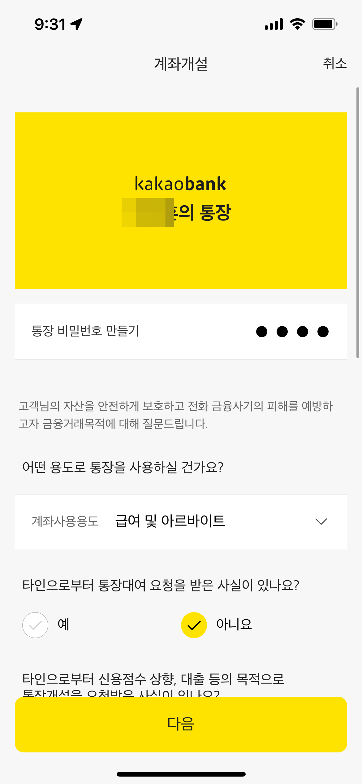 카카오뱅크 입출금통장 관련 약관 확인 후 동의를 하시고, 다음을 눌러줍니다.