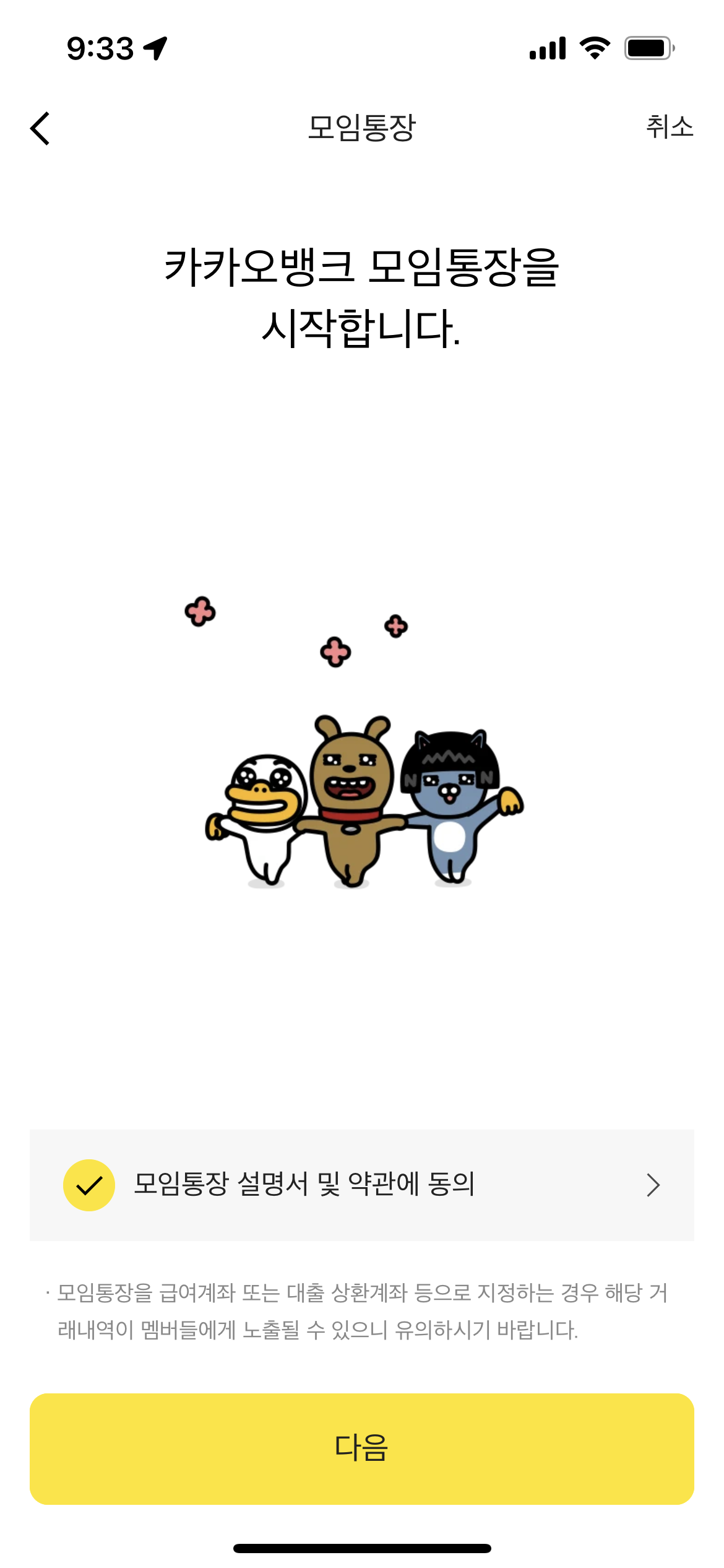 모임통장 설명서 및 약관 확인하신 후 동의 후 다음을 눌러줍니다.