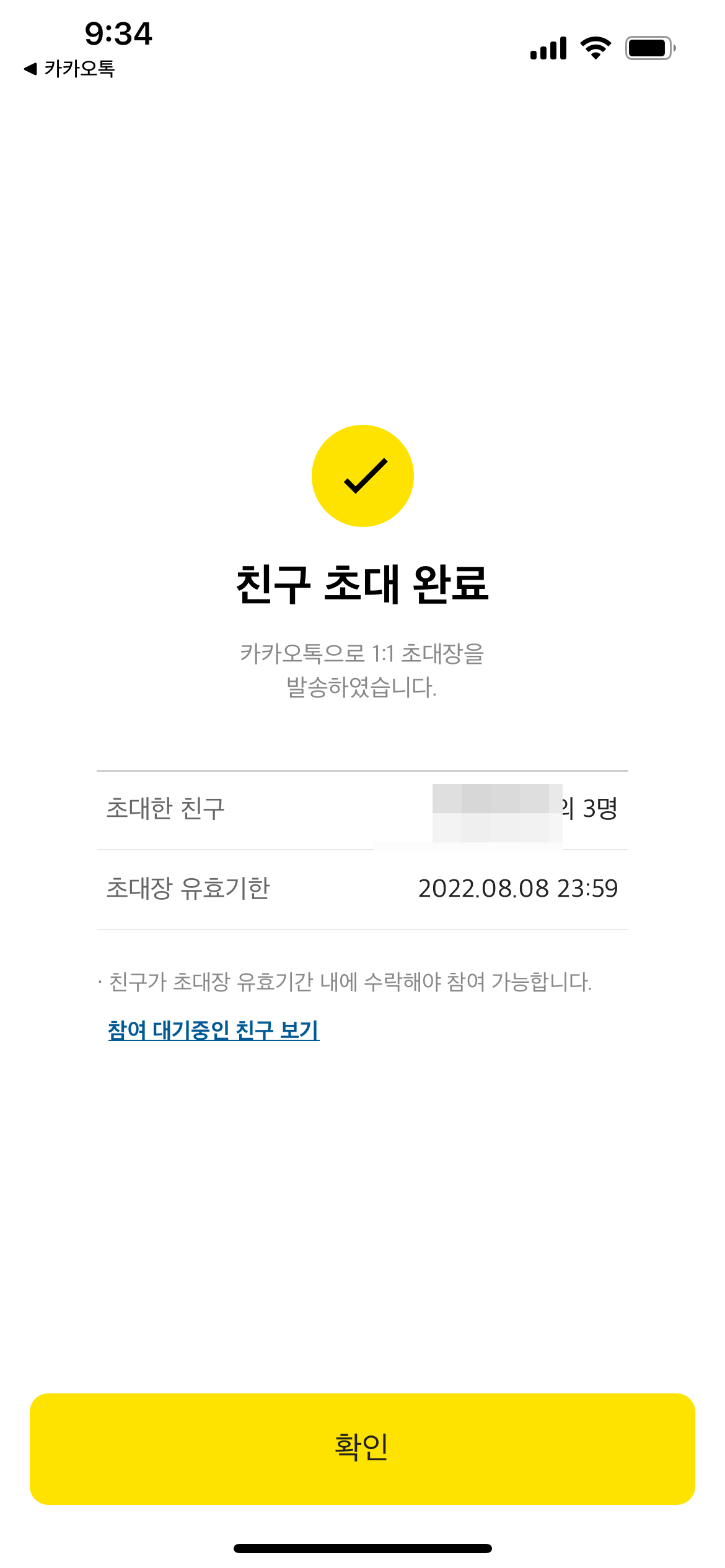 모임통장 신청이 완료되었다는 메시지가 뜨면, 이제 모임통장에 참여할 멤버를 초대하실 수 있습니다.