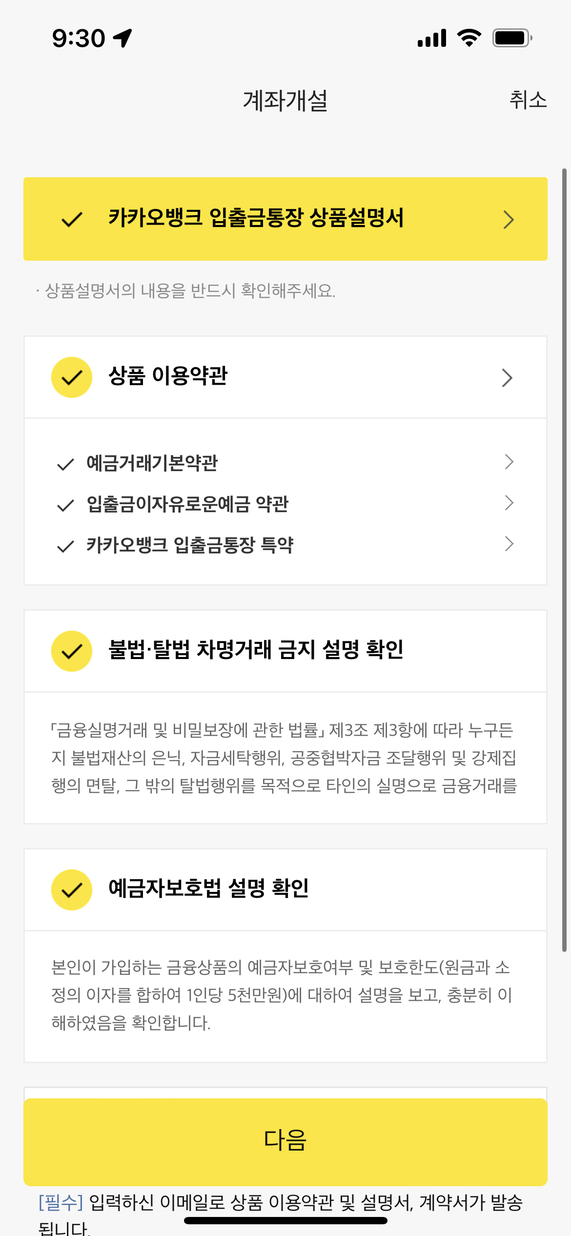 카카오뱅크 입출금통장 관련 약관 확인 후 동의를 하시고, 다음을 눌러줍니다.