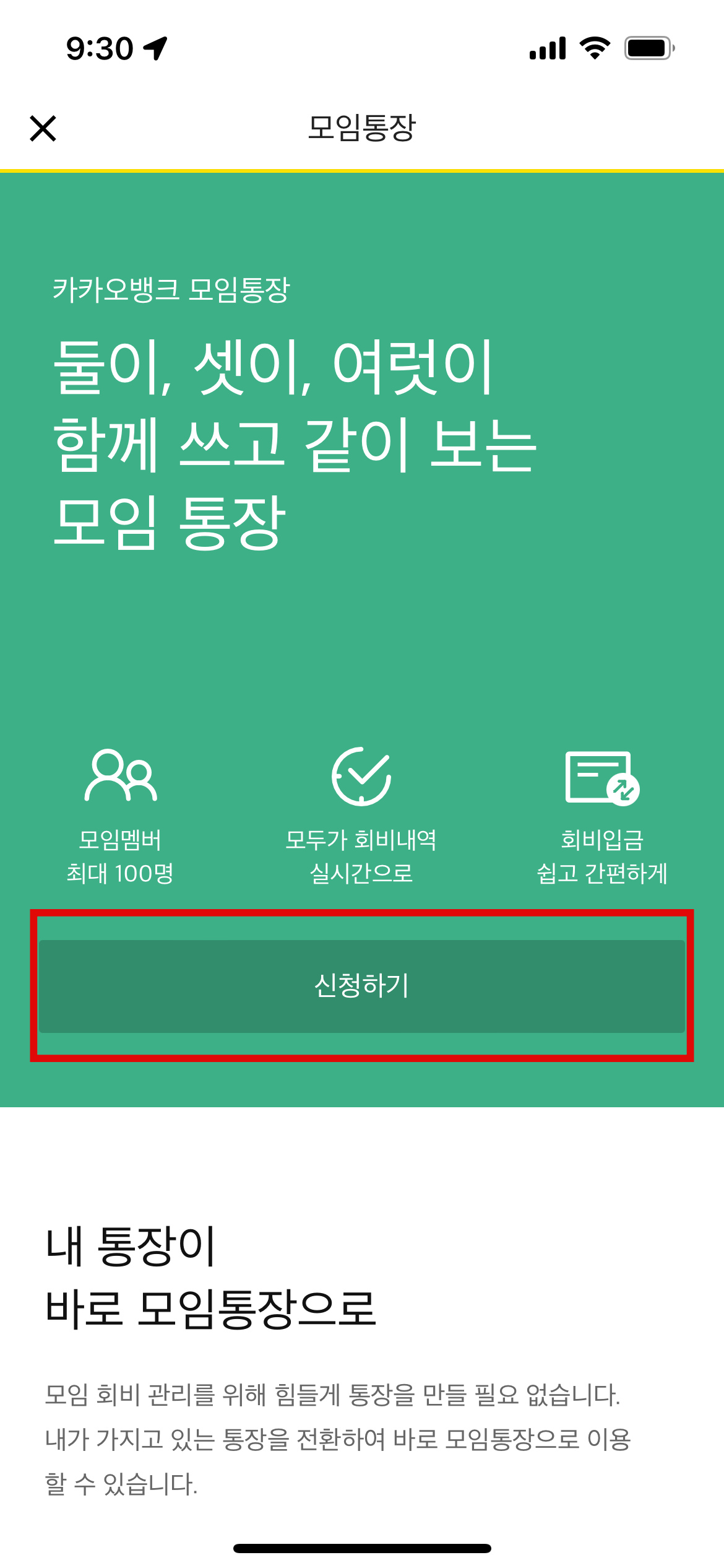 그럼 카카오뱅크 모임통장에 대한 특징이 설명되어 있는 화면으로 진입합니다. 모임 멤버는 최대 100명이나 가능하고, 모든 회비 내역은 실시간으로 공유되기 때문에 편리한 것이 특징입니다. 중앙에 있는 "신청하기"를 눌러줍니다.