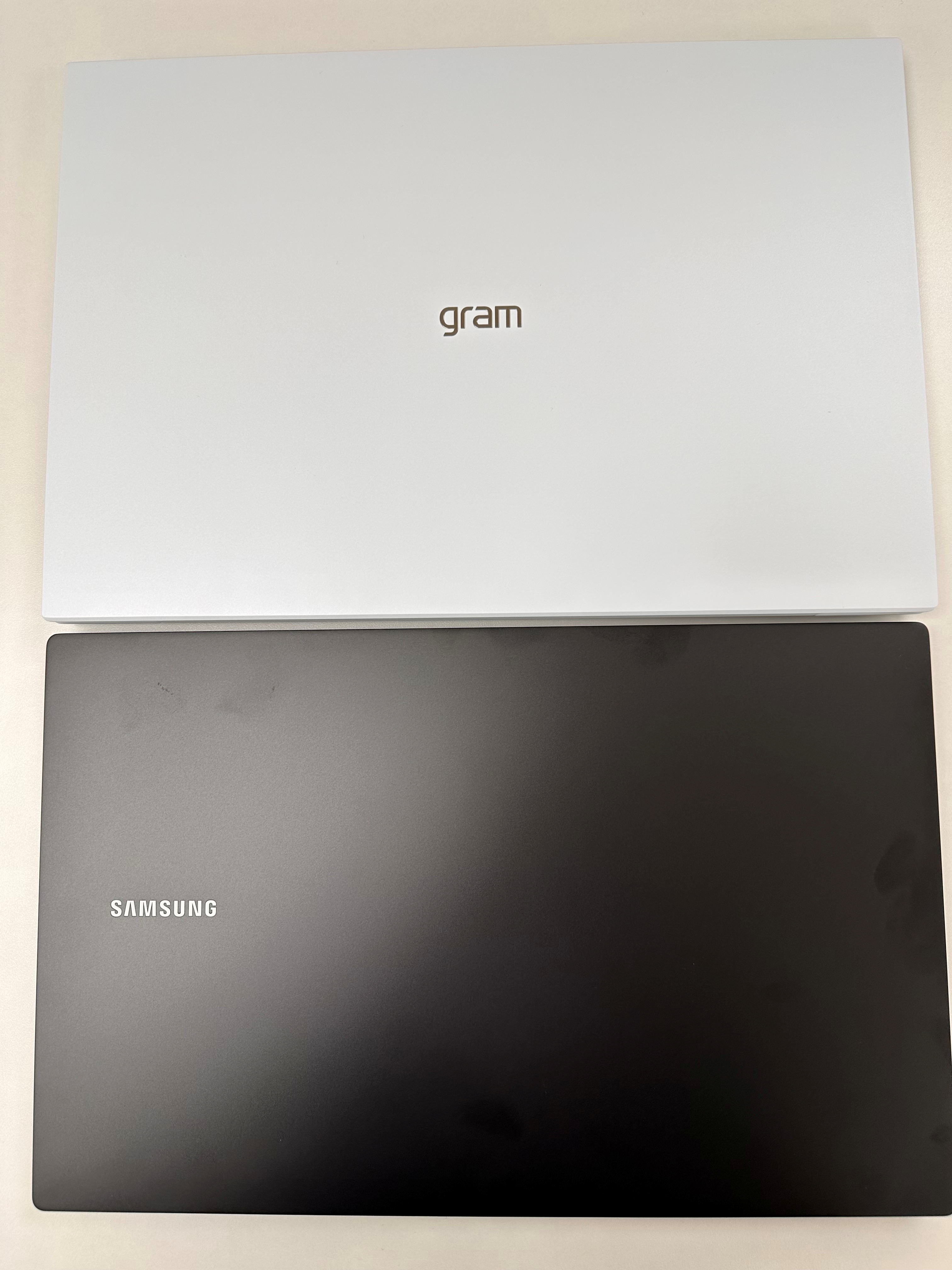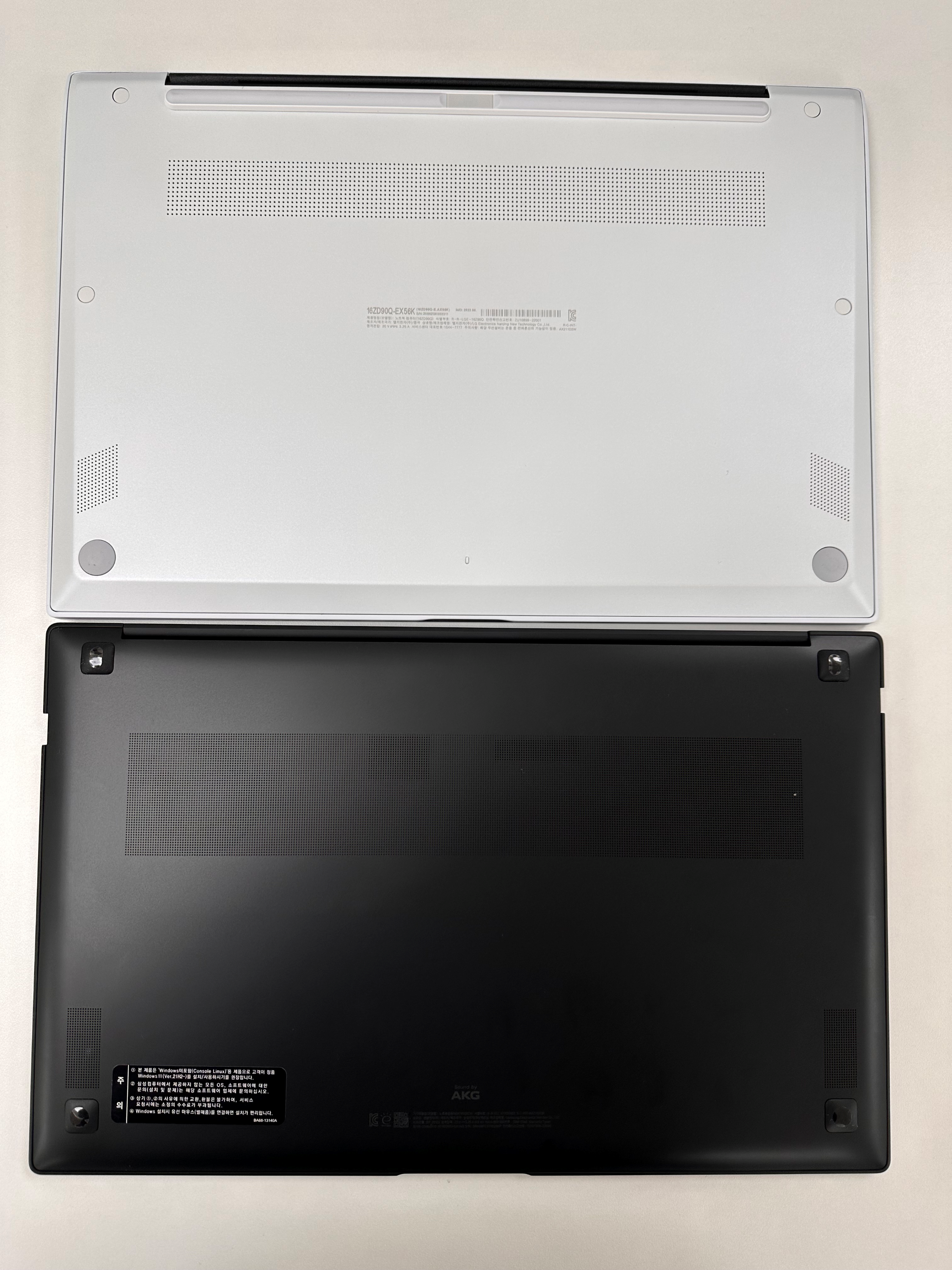 LG 그램 16 화이트와 삼성 갤럭시북2 프로 블랙 모델 상판 크기입니다.