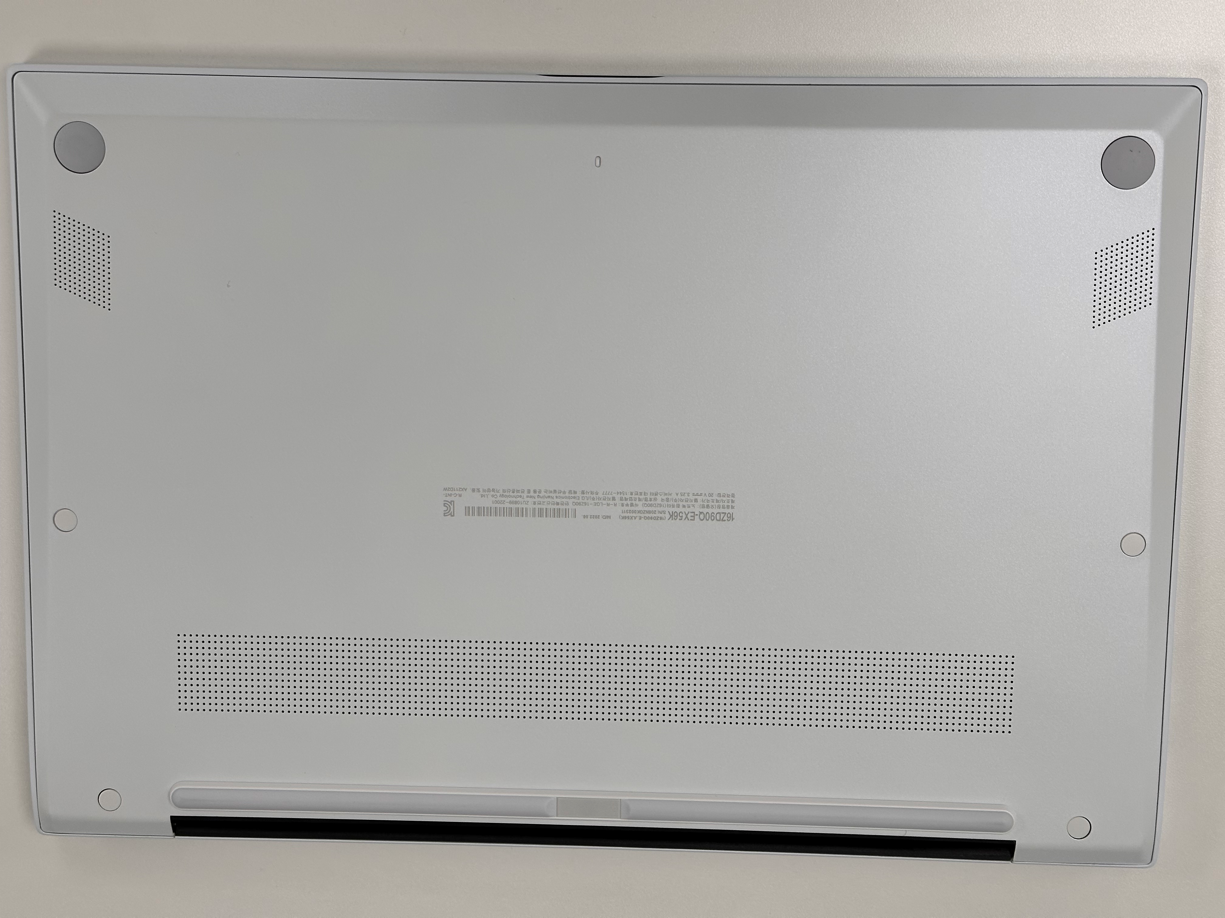 전면에는 그램 로고가 박혀있고(스티커입니다.;;;) 하판에는 열 방출을 위한 구멍들과 함께 하단에 스피커 2개가 양쪽으로 자리하고 있습니다.