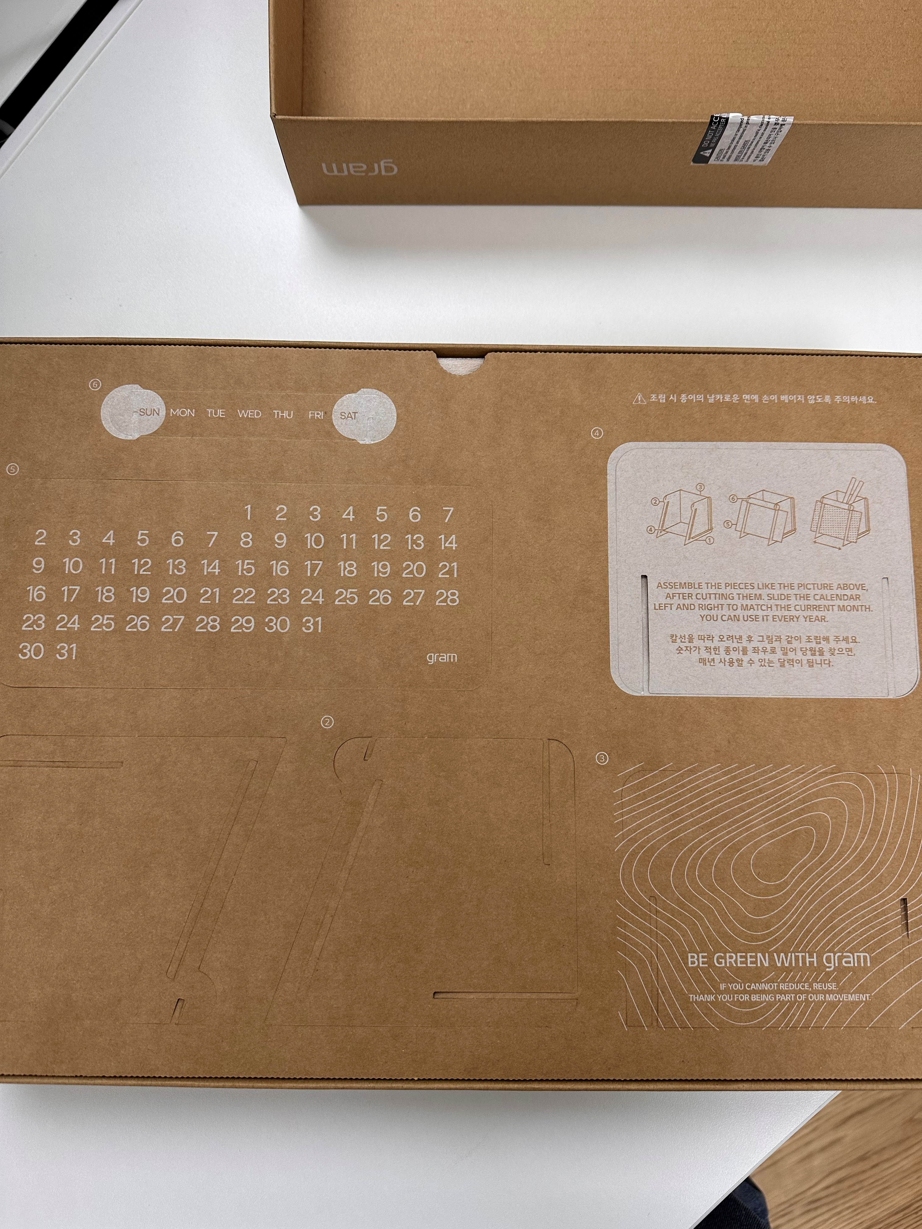 박스를 열면, 캘린더로 활용할 수 있는 박스 한 장이 더 나옵니다. LG 그램뷰와 포장이 완전히 똑같아 보이네요.