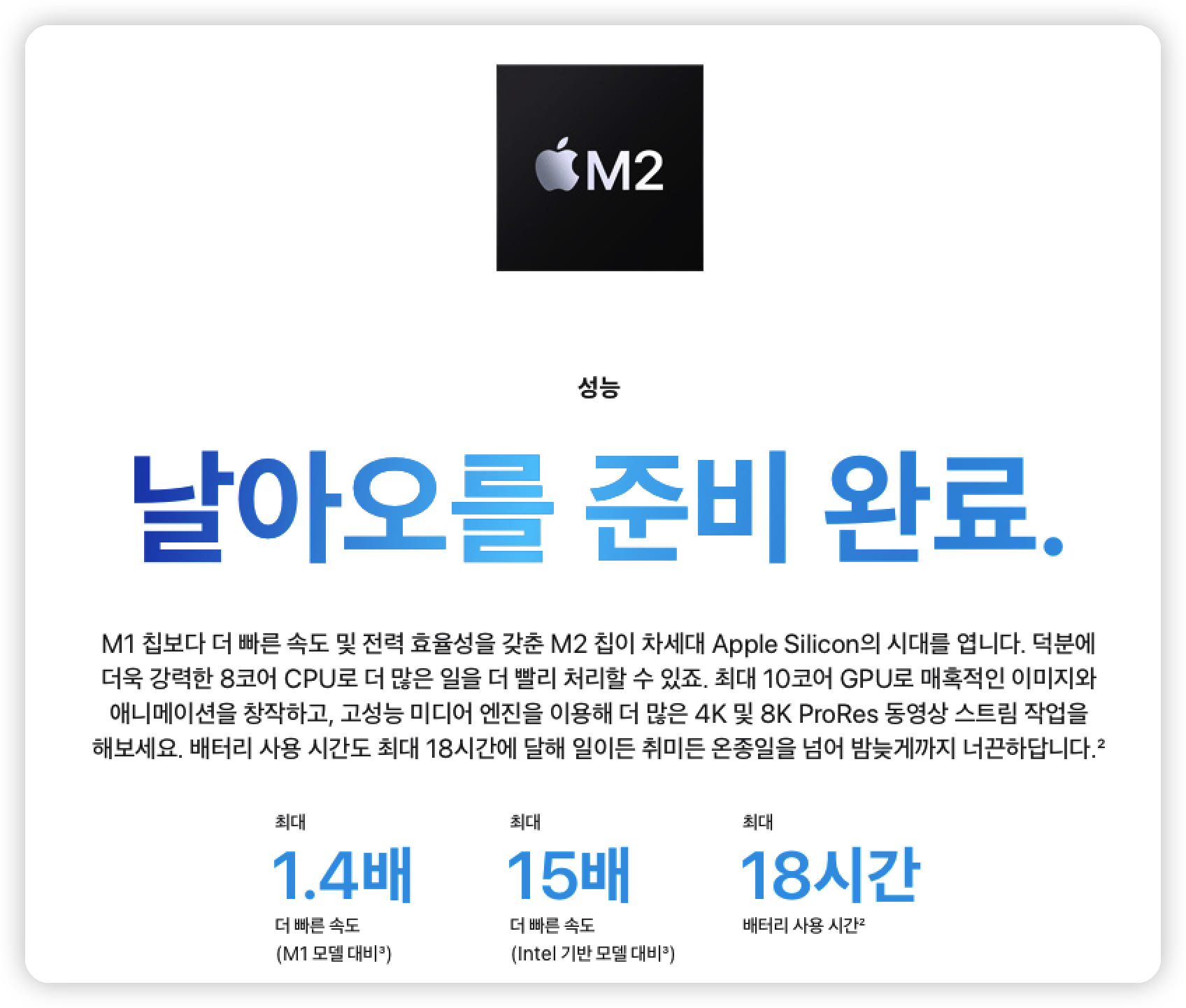 M1 칩셋 대비 최대 40% 더 빠른 속도, 인텔 기반 맥북에어 대비해서는 최대 15배 더 빠르다고 하는데요.