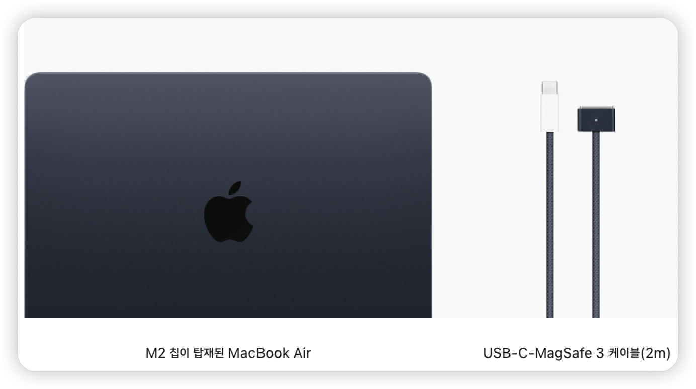 이번 M2 맥북에어에는, 이름에서도 알 수 있듯 M1의 후속인 M2 칩셋이 탑재되었습니다.