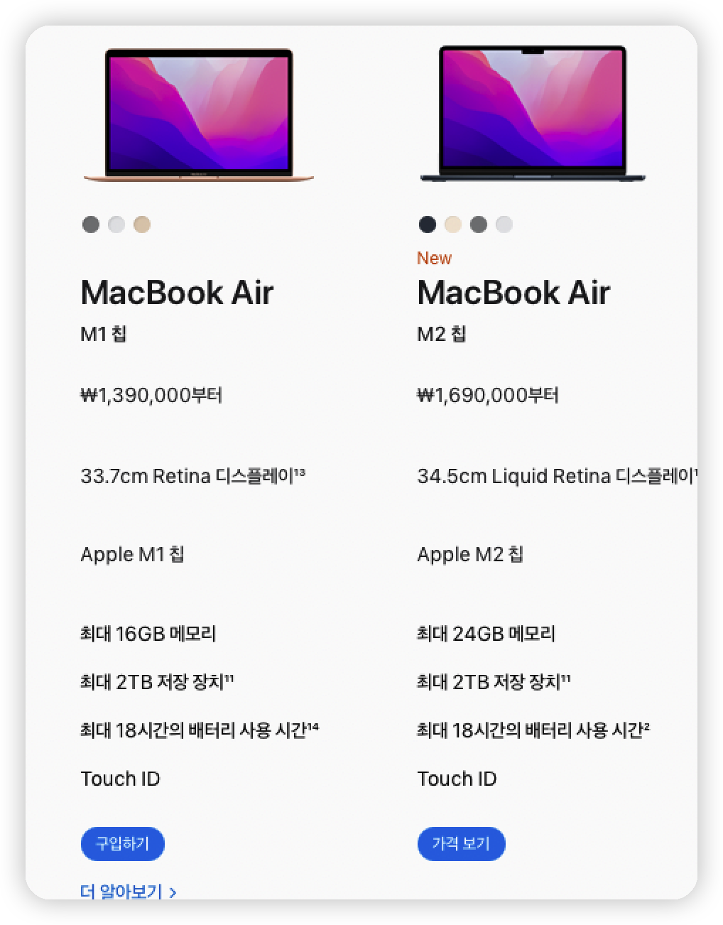 M2 맥북에어는 생각보다 많은 점이 바뀐 것은 분명합니다. 하지만 그럼에도 불구하고 기존 M1 맥북에어와 크지 않은 성능차이, M1 맥북에어 기본 가격 인상까지 맞물려 오늘 기준 최후 승자는 "M1 맥북에어 싸게 사서 쓰고 계신 분들" 아닌가 싶은 생각이 듭니다.