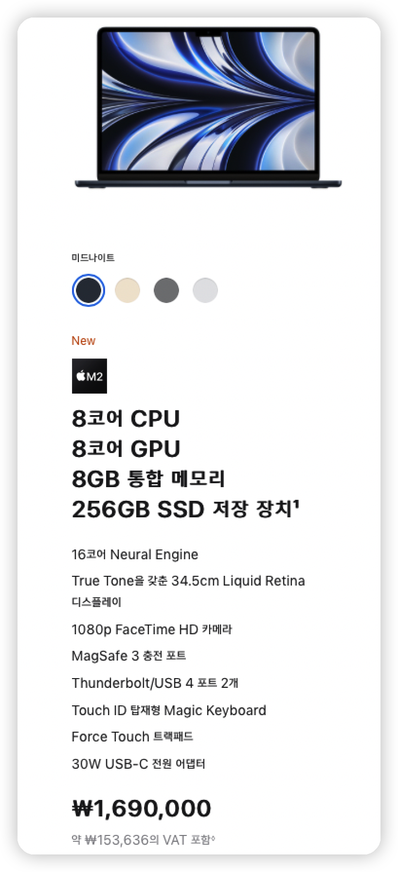 M2 맥북에어 8코어/8GPU/ 8GB / 256GB 모델이 169만 원부터 시작입니다. 환율도 많이 올랐고, 반도체 수급 문제 등 대외적인 요인 때문에 가격 상승은 어느 정도 예상됐던 바입니다.