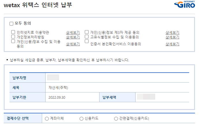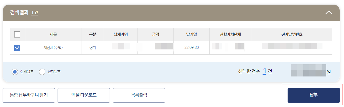 해당 재산세 항목을 클릭하신 후, 우측 하단 납부 버튼을 눌러줍니다.