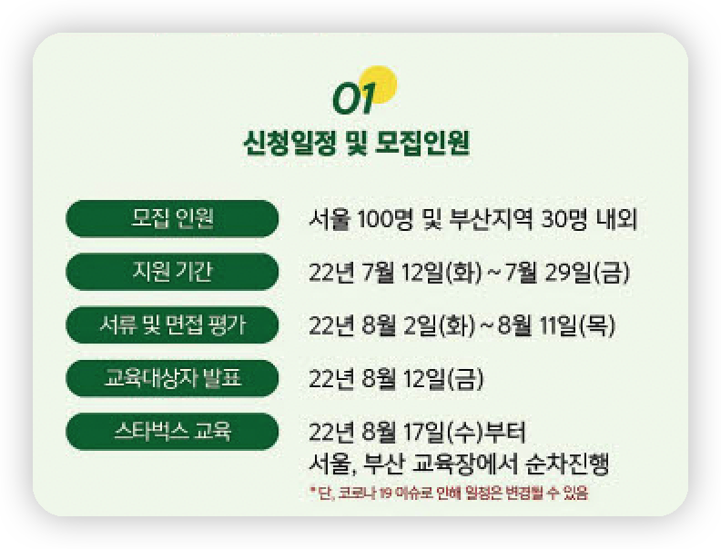 또한 단순히 교육만 하는 것이 아닌 교육생 중 우수한 인원을 대상으로 전국 스타벅스 매장에서 진행하는 별도 채용전형 역시 진행할 계획이라고 하니 창업 여건이 어려우시거나 안정적 취업을 원하시는 분들은 충분히 고려해 볼 만한 것 같습니다.