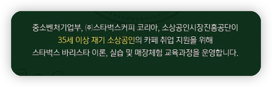 이 프로그램은 위에서 말씀드렸다시피 소상공인의 재기 발판을 마련해 주는 것이 목적입니다. 특히 국내에서 가장 인기 있는 스타벅스 코리아와 함께 하는 프로그램이기 때문에, 스타벅스 바리스타 이론 및 실습 교육을 받으실 수 있으며 매장 체험 시간도 있다고 합니다.
