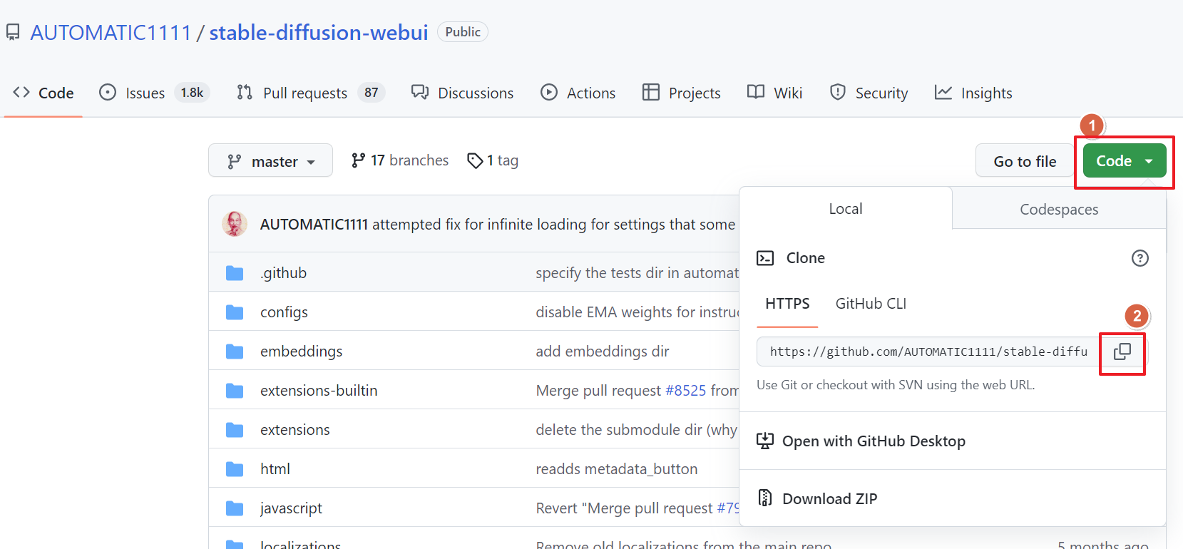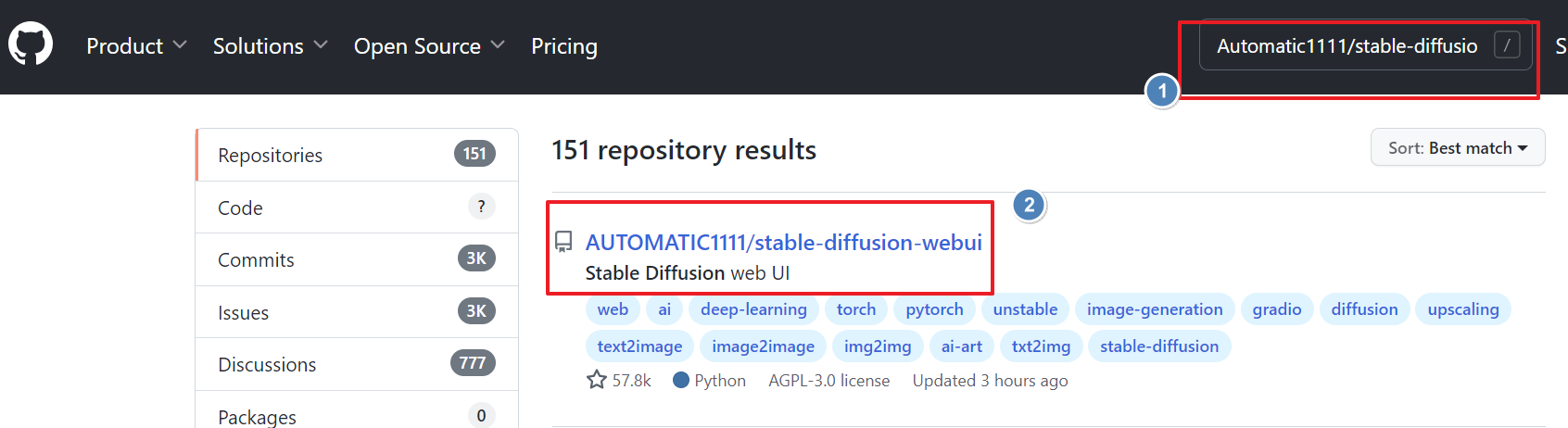위와 같이 나오면 정상적인 검색결과입니다. 위 2번 AUTOMATIC1111/stable-diffusion-webui를 눌러줍니다.