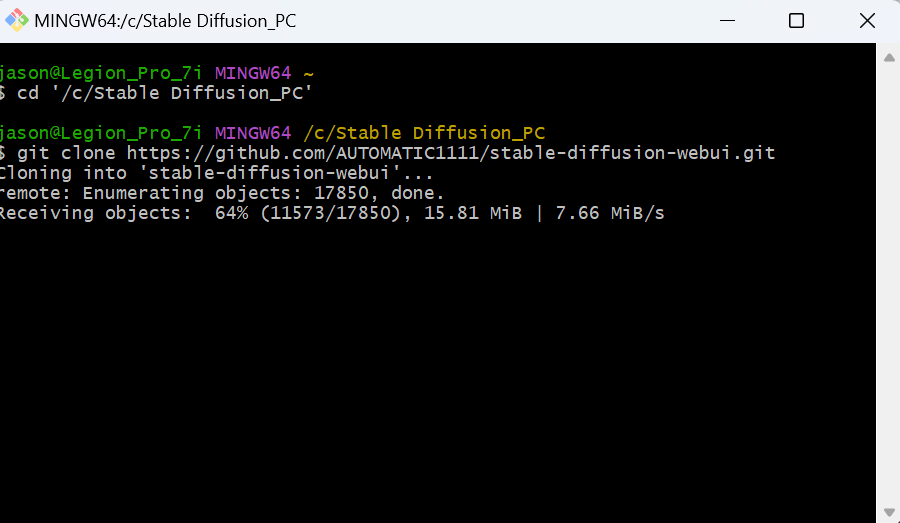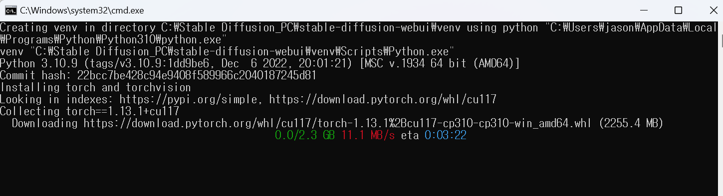 그러면 아래 사진과 같이 스테이블 디퓨전 PC 설치가 시작됩니다.