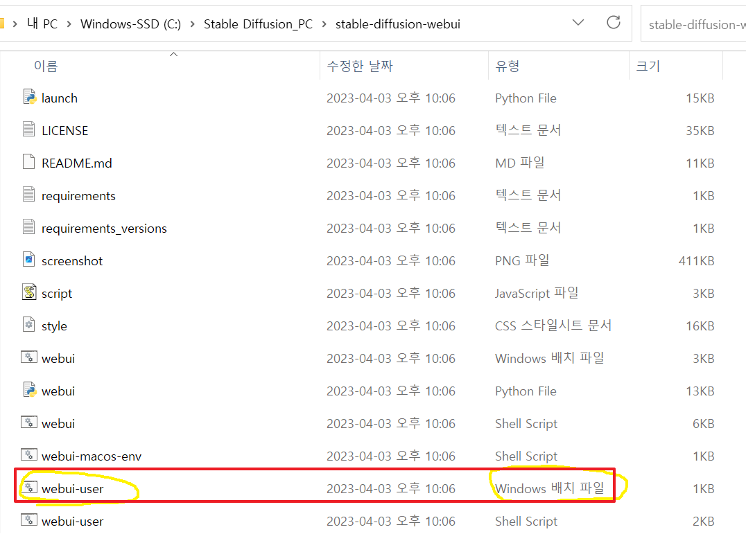 설치 폴더에 보시면, 맨 아래쪽에 webui-user이라는 파일이 있습니다. 여기서 유형이 "Windows 배치 파일"인 것을 더블클릭해서 실행해 줍니다. 그러면 이제 최종적으로 모든 세팅이 완료된 스테이블 디퓨전 PC 설치가 통합적으로 진행됩니다.