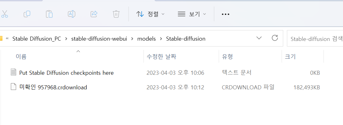 이제 모든 설치 준비는 끝났습니다. 실행파일 하나만 실행해서 통합 설치를 진행하면 되는데요, 그전에 아까 다운로드하였던 체크포인트 파일이 정상적으로 다운로드 및 아까 말씀드린 경로에 들어가 있는지 다시 한번 확인해 줍니다. 그러고 나서 스테이블디퓨전을 설치한 폴더로 이동합니다.