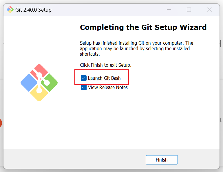 설치 완료 후에, 가장 마지막 화면에서 "launch Git bash"를 체크해 주신 후, finish를 눌러줍니다.