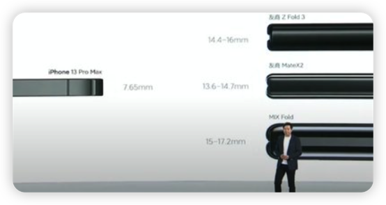 무게보다 더 충격적인 부분은, 바로 두께입니다. 믹스 폴드2를 접으면 그 두께가 11.2mm에 불과합니다. 폈을 때는 무려 5.4mm라는 경이적인 두께입니다. 이는 둔탁한 느낌의 폴더블 스마트폰에서 대단히 매력적인 포인트입니다.