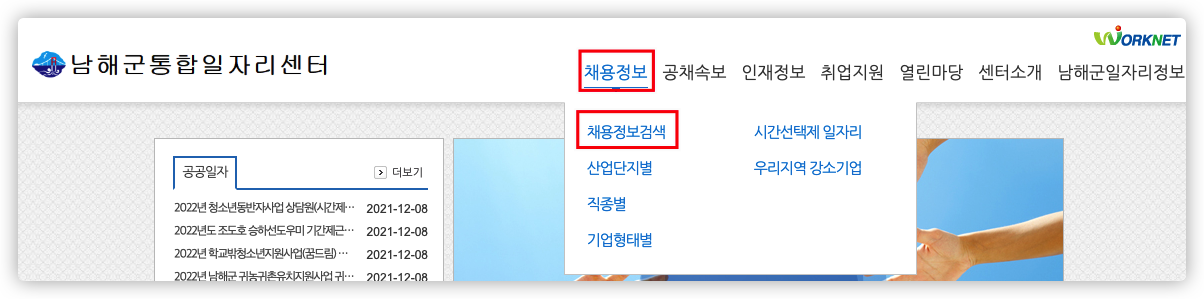 워크넷 남해군통합일자리센터 홈페이지 위쪽 메뉴에서 "채용정보"를 눌러보시면, "채용정보검색"이라는 메뉴가 뜹니다.