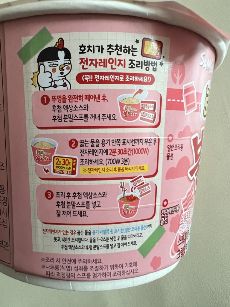 전자레인지 조리가 기본 레시피이기 때문에, 뚜껑을 남기지 않고 완전히 다 따 줍니다. 개인적으로 면이 더 잘 익는 전자레인지 조리 가능한 컵라면을 훨씬 더 선호하기 때문에 고민의 여지 따위는 없습니다.