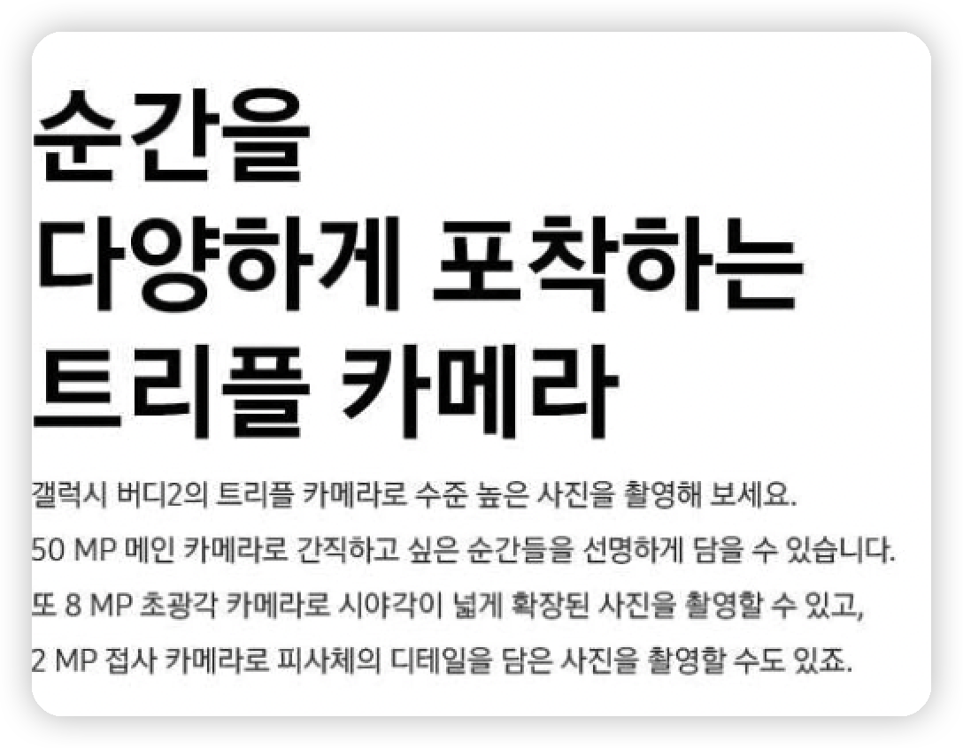다음은 갤럭시 버디 2의 카메라 성능을 둘러보겠습니다. 5천만 화소의 F1.8 조리개 값의 메인 광각렌즈, 8백만화소 초광각 카메라와 2백만화소 접사 카메라가 달려 있습니다. 일단 트리플 카메라로 구성은 맞춘 모양새이지만, 저가형 스마트폰이기 때문에 메인 광각 카메라를 제외한 스펙은 썩 만족스럽지 못한 것 같습니다. 저가형 스마트폰임을 감안하면, 그래도 메인 카메라 성능은 나름 괜찮을 것으로 생각됩니다.