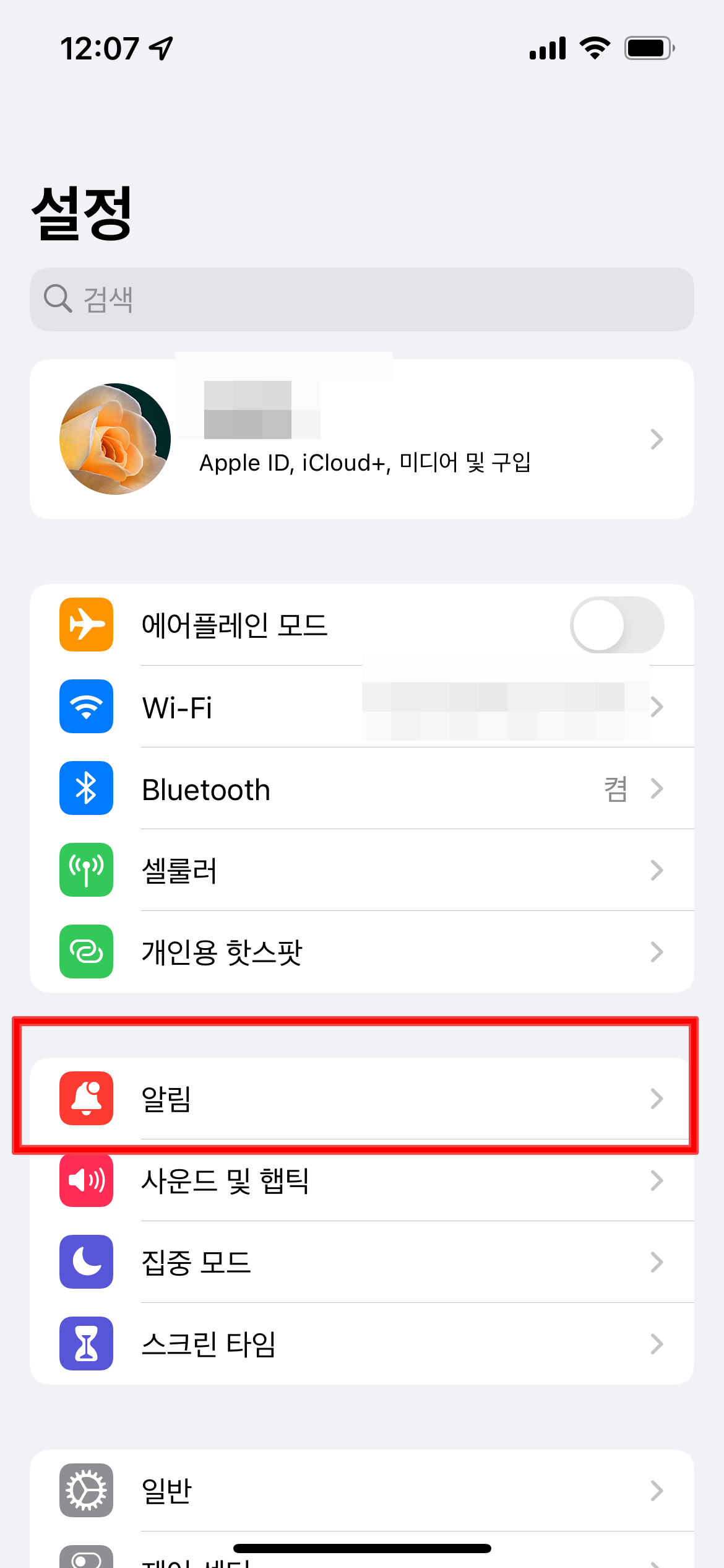 설정-알림에 진입하면, 앱별로 알림 세팅을 할 수 있도록 앱이 순서대로 정렬되어 있습니다.