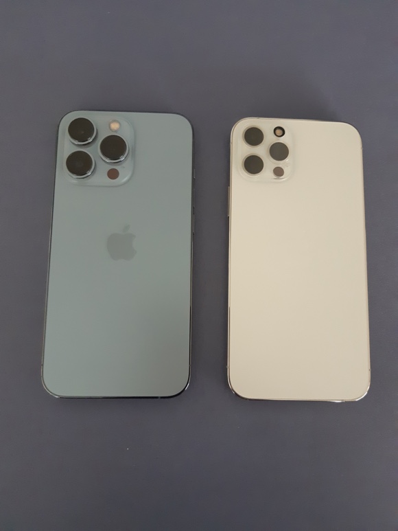 먼저 꽤 어두운 실내에서 촬영한 아이폰13 프로 시에라 블루와 아이폰 12 프로 실버 색상입니다.