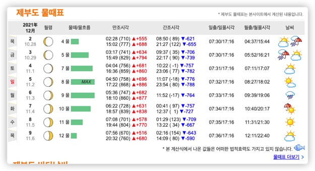 바다타임에 들어와 보시면, 제부도 물때표가 요일별, 날짜별로 잘 정렬이 되어 있습니다.