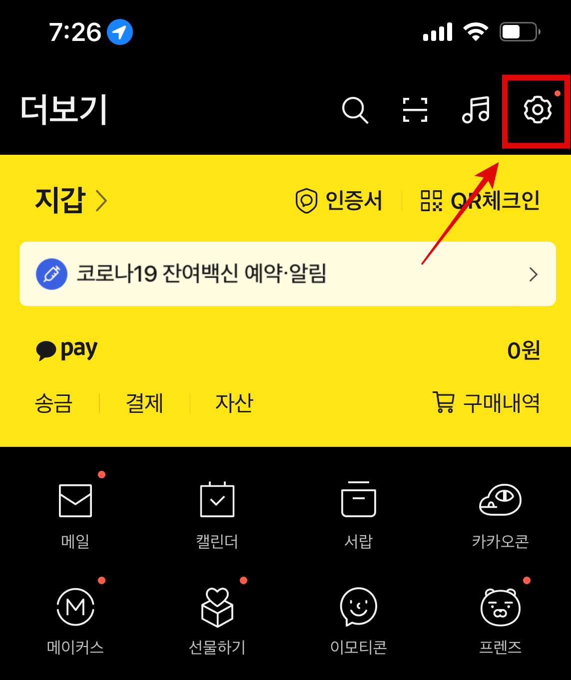 먼저 카카오톡을 켜시고, 맨 오른쪽 하단에 점 3개를 눌러보시면 이렇게 더 보기 메뉴가 나옵니다.
