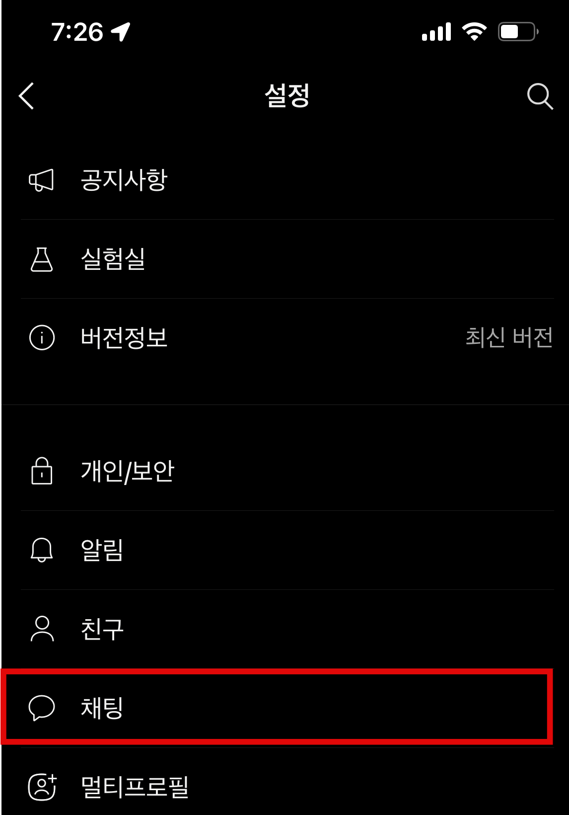 설정에 들어오시면, 중간 즈음에 "채팅" 메뉴가 있습니다. 카카오톡 대화를 관리하는 메뉴인데요.