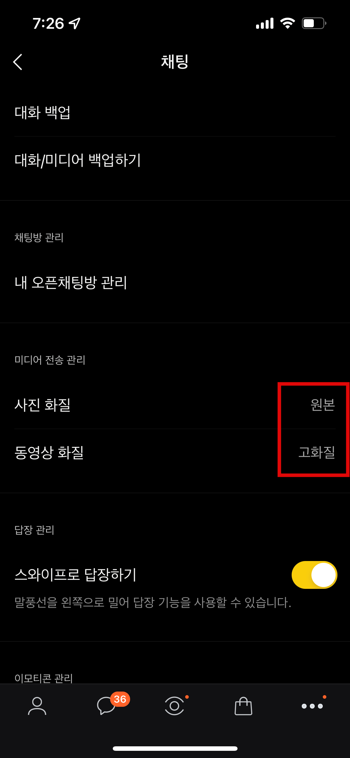 채팅 메뉴에 들어오시면, 중앙에 사진 화질과 동영상 화질이 있습니다.