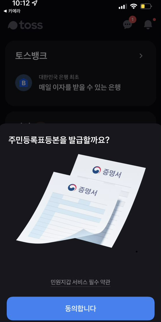 뱅킹 서비스로 유명한 토스에서 이번에 토스를 이용한 주민등록등본 인터넷 발급이 가능하도록 서비스를 시작했다고 합니다.
