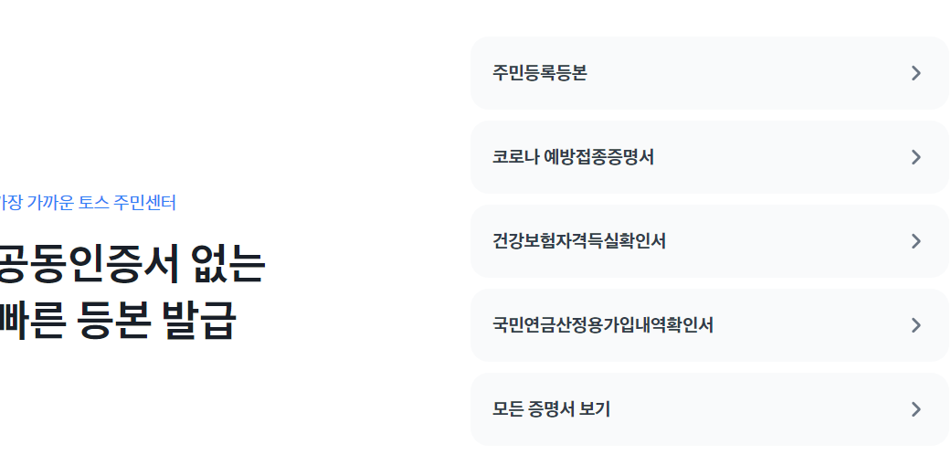 토스 웹 홈페이지를 접속하시면, 이렇게 주민등록등본과 예방접종증명서 등 공동 인증서 없이 신청할 수 있는 항목들이 있습니다. 주민등록등본을 한번 눌러보겠습니다.
