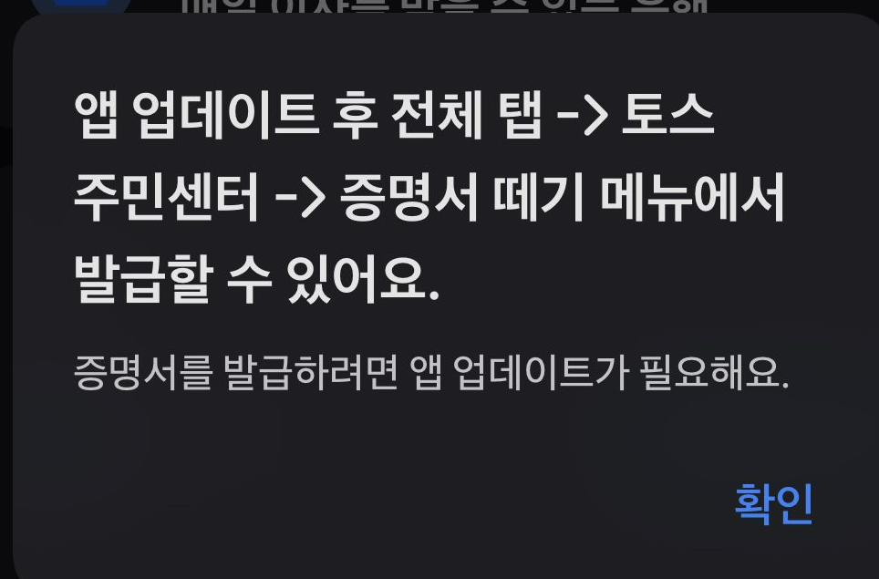 QR을 찍어서 토스 앱을 켜니, 업데이트를 해야 사용 가능하다고 뜨네요. 앱을 최신 버전으로 업데이트 후 다시 찍어보았습니다.
