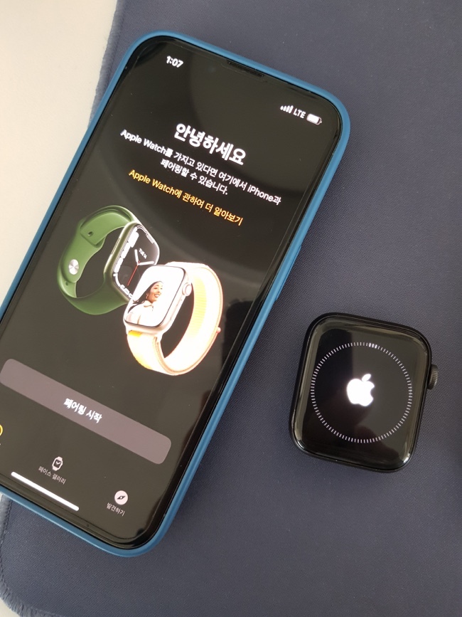 애플워치애플 워치 페어링 해제가 완전히 완료되면, 위 사진과 같이 watch 앱에서는 새로운 애플 워치를 페어링 하는 초기 화면이 뜨고, 애플 워치는 모든 설정 재설정이 스스로 진행됩니다. 애플 워치 사과 로고 및 로딩이 끝나고 나면 애플 워치를 아이폰에 갖다 대라는 초기 화면이 뜹니다.